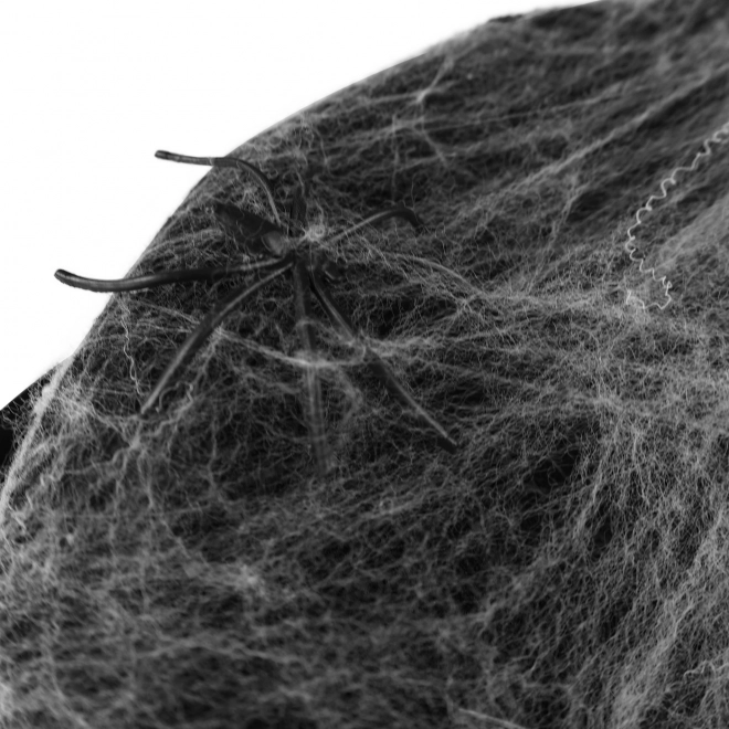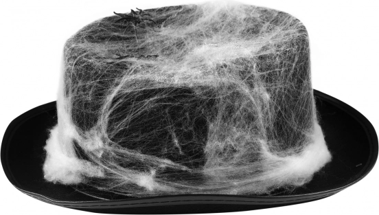 A fekete kalapon lévő fehér műpókháló erős kontrasztot kelt és élethű hatást nyújt – ideális Halloweenhez és horror témákhoz.