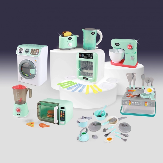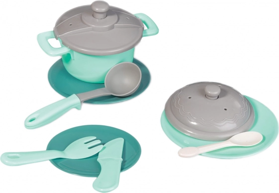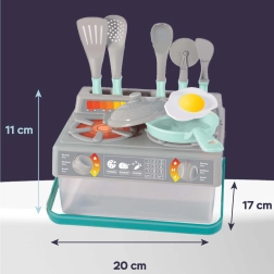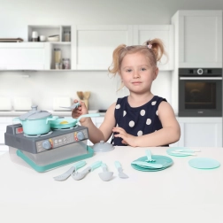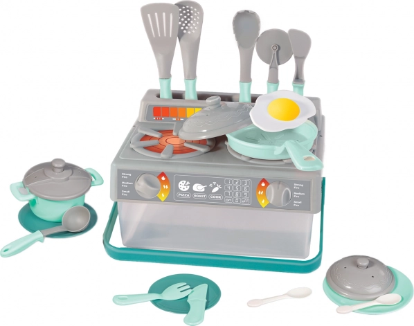Ez a szürke és türkiz gyermek konyhai készlet tartalmazza mindazt, amire a gyermeknek szüksége van a főzős játékhoz. A készlet részei: