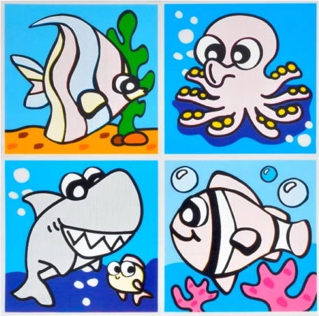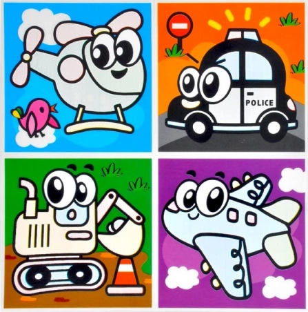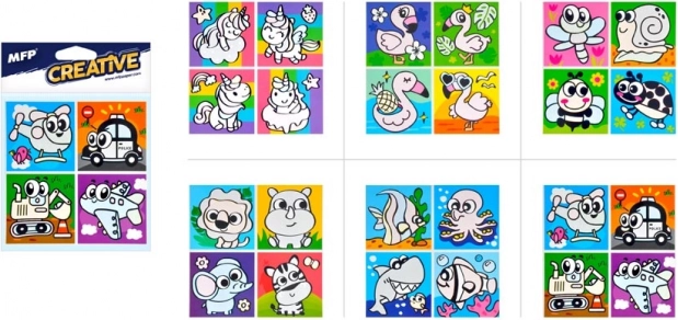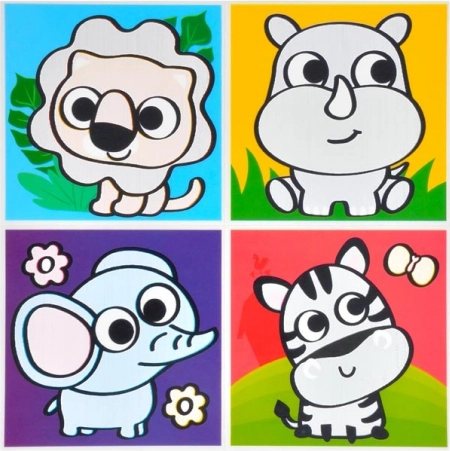 A csomag különböző motívumokat tartalmaz, beleértve állatokat és közlekedési eszközöket. Minden lap négy képet tartalmaz, amelyek tökéletesen illenek a gyerekfürdőszobába.