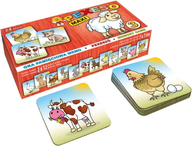 A népszerű gyerekjáték, a PEXESO Udvari állatkák kiadásban fejleszti a memóriát, a koncentrációt és a háziállatok felismerését. A vastagabb, 3 mm karton megkönnyíti a kártyák megfogását és megfordítását, ideális a legkisebb játékosoknak. A csomag 24 kártyát tartalmaz 7 × 7 cm méretben, aranyos motívumokkal (kutya, macska, tehén stb.).