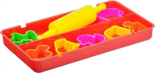 A készlet színes, különböző alakú műanyag formákat és egy könnyű, sárga hengert tartalmaz, amelyekkel a gyerekek könnyedén kinyújtják és kivágják a tökéletes motívumokat.