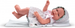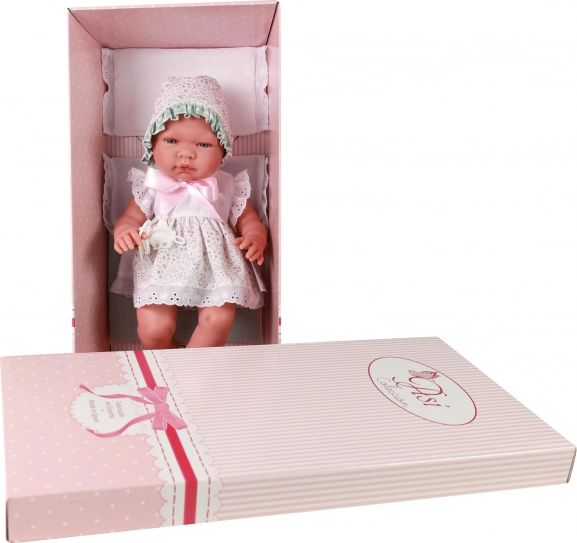 A baba gyönyörű fehér csipkés ruhácskát és sapkát visel, párnával, takaróval és láncos cumival érkezik, amely a szájába helyezhető. Szerepjátékhoz ajánlott, fejleszti az empátiát, a finommotorikát és a képzelőerőt.