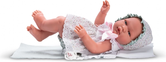 Az arc részletes vonásai, a nem pislogó kék akril szemek és a ragasztott szempillák hiteles kifejezést kölcsönöznek a María babának. A teljes vinil test masszív és tartós a mindennapos játékhoz.
