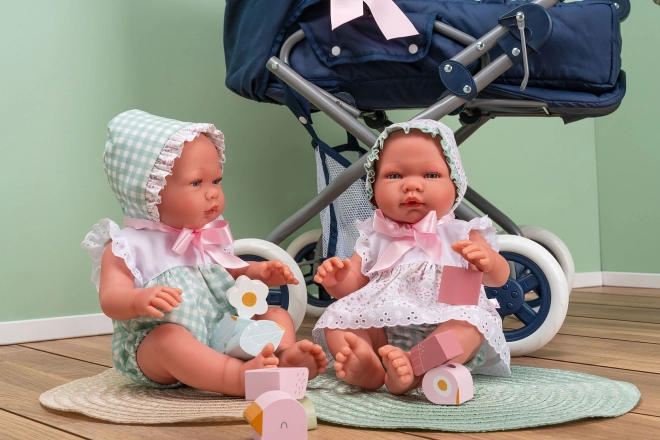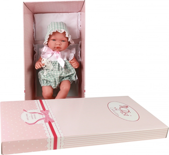 Pablo stílusos zöld-fehér ujjatlan nyári overált visel rövidnadrágszárral, fehér csipkedísszel, kiegészítve megkötős sapkával. Puha párnán, takaróval fekszik, és láncos cumija a szájába helyezhető, ahol stabilan tart. Az ASI (Asivil) több mint 50 éves múltra visszatekintő családi spanyol márka, amely 100%-ban helyi, kézműves gyártásra és szigorú európai szabványokra épít.
