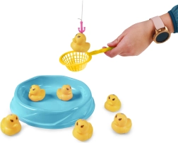 Szórakoztató vizes játék kis horgászoknak: tartalmaz egy mágneses horgászbotot, egy műanyag mini tavat és 6 aranyos kacsát. Csak töltsd meg a tálat vízzel, tedd bele a kacsákat, és kezdődhet a horgászat – könnyen és biztonságosan a mágneseknek köszönhetően. Remek móka, amely fejleszti a finommotorikát és a kéz–szem koordinációt.