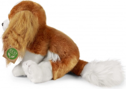 Aranyos, 28 cm-es plüss Cavalier King Charles spániel, kiváló minőségű plüssből, élethű megjelenéssel, puha szőrrel és környezetbarát, újrahasznosított PET palackokból készült töltettel. Ideális társ ölelgetéshez, játékhoz és elalváshoz már újszülött kortól.