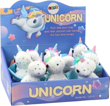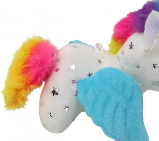 Lépj be a varázslat világába ezzel a plüss unikornissal, amelyet a gyerekek első érintésre megszeretnek. A puha fehér bunda ezüst csillagokkal, a színes sörény és farok, valamint a bájos kék szárnyacskák egyedi varázst kölcsönöznek a játéknak. A zsinór felhúzása után az unikornis ugrálva mozog és csóválja a farkát, így a móka sosem ér véget.