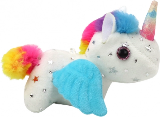 A bájos plüss unikornis puha fehér bundájával, ezüst csillagokkal, színes sörényével és farkával minden gyermeket elragadtat. A felhúzható zsinórnak köszönhetően vidáman ringatózik és csóválja a farkát, ami mozgással teli szórakozást nyújt. Kompakt mérete jól illik a gyerekek kezébe, és támogatja a motorikus készségek és a fantázia fejlődését.