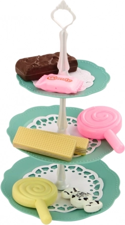 Elegáns türkiz emeletes tálca három szinttel, amelyen szépen kiállíthatók az összes desszert, és valódi cukrászda-hangulatot varázsol a játékba.