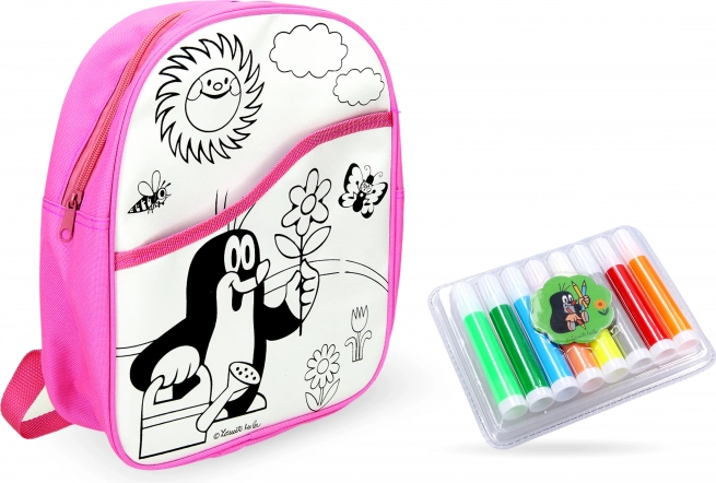 Színezhető hátizsák rózsaszín Kisvakond mintával ideális ajándék 3 éves és annál idősebb gyermekek számára. A hátizsákhoz 8 színes filctoll tartozik, amely lehetővé teszi a gyermekek számára, hogy saját tervezéseket hozzanak létre és fejlesszék kreativitásukat.