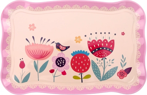A dekoratív, virágmintás tálca megkönnyíti a hordozást, és igazi kávéházi hangulatot ad a szervírozásnak.