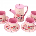 Tálca, kancsó, 4 csésze, 4 tányér és kiegészítők – a gyerekeknek minden kéznél van a stílusos teadélutánokhoz és a fantázia fejlesztéséhez.