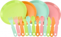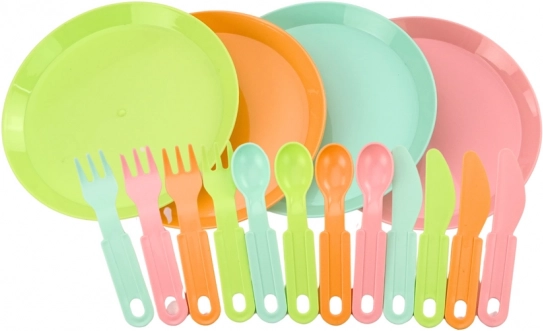 .A vágódeszka elengedhetetlen az „ételkészítéshez”, és biztonságos a gyerekek számára. Négyszemélyes evőeszközkészlet: villák, kések és kanalak, így együtt „étkezhettek” barátokkal vagy a családdal. Négy színes tányér a saláták és gyümölcsök tálalásához.