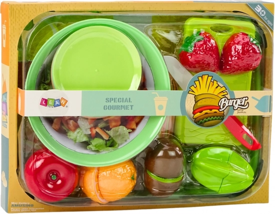 A saláta- és gyümölcsvágó játékkészlet remek választás azoknak a gyerekeknek, akik szeretnek főzni és ételeket „készíteni”. A készlet 25 darabból áll. A nagy tálca tágas és praktikus, ideális az ételek tálalásához. A salátástál friss zöldségeket utánzó elemekkel ösztönzi a gyerekeket a játékra és az egészséges táplálkozás megismerésére.