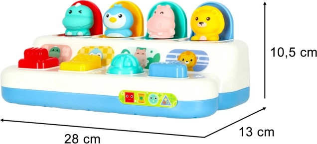 A színes panelek krokodilt, pingvint, vízilovat és oroszlánt rejtenek. A vezérlő megnyomása vagy elcsúsztatása után az állat felpattan, és egy kielégítő „kattanás” hallatszik.