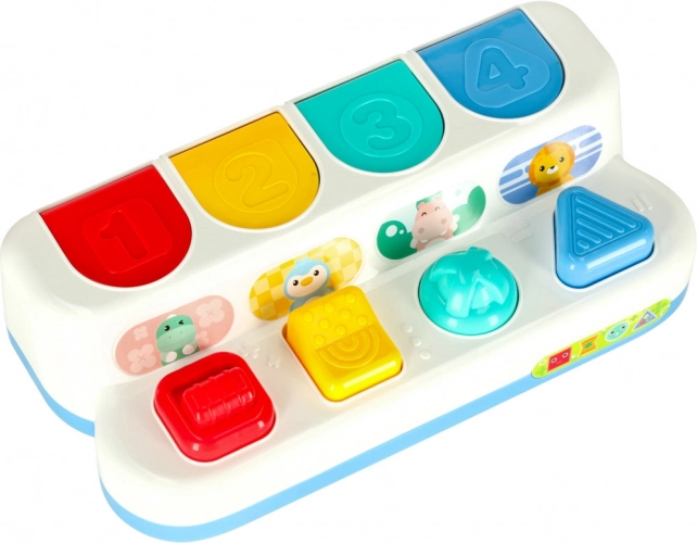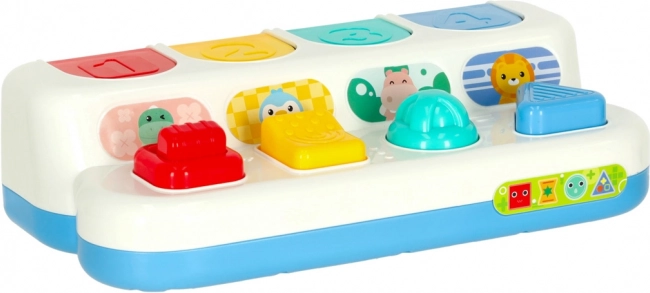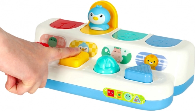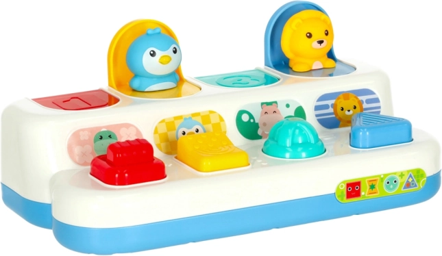 Ez az interaktív felugró játék ötvözi a tanulást és a szórakozást. A gyerekek felfedezik a színeket, formákat és számokat, miközben gyakorolják a koncentrációt és a logikus gondolkodást. Minden panel más mechanizmussal működik – nyomás, csúsztatás vagy forgatás – és a helyes művelet után felpattan egy aranyos állat. A jellegzetes „kattanás” támogatja a hallási észlelést.