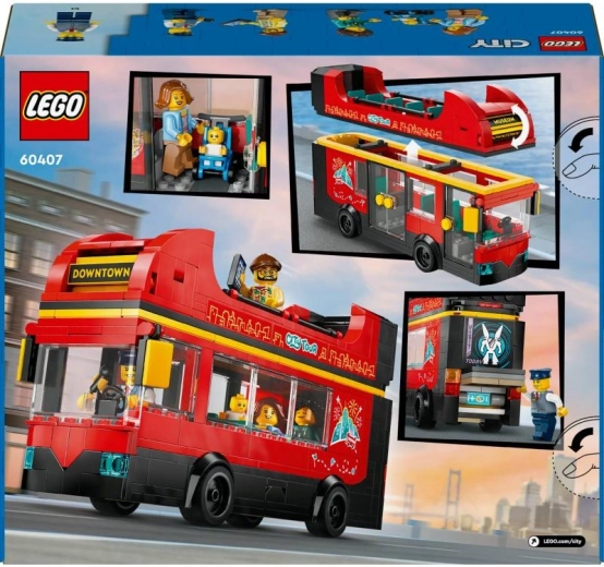 A LEGO City piros emeletes busz két szinten nyújt autentikus szórakozást a gyerekeknek. Forgasd el a célállomás táblát, és irány a kikötő, a belváros, a múzeum vagy a park. Az öt minifigura – köztük egy baba babakocsiban – és a kiegészítők, mint a mikrofon, telefon és fényképezőgép még gazdagabbá teszik a szerepjátékot.