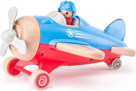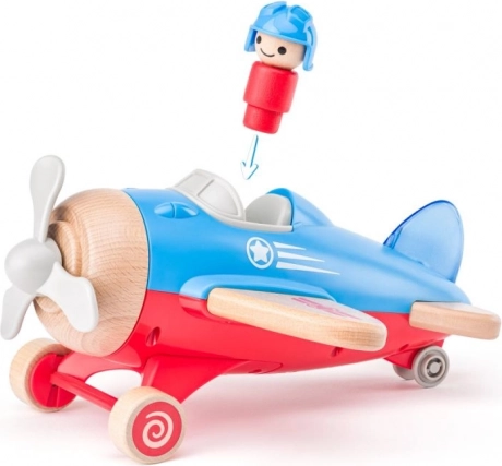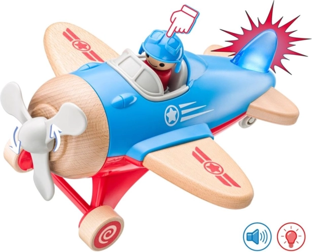 A repülőgép forgó propellerrel és kis pilóta figurával van ellátva, ösztönözve az interaktív játékot.