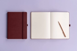 Pontozott jegyzetfüzet stílusos bordó színben, ideális a klasszikus és elegáns megjelenés kedvelőinek. Tökéletes jegyzetek készítéséhez, céges logóval testreszabható.