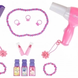 A gyerekek játszhatnak hajszárítóval, fésűvel, parfümös üvegekkel, gyöngyökkel, karkötőkkel, gyűrűkkel és sok más kiegészítővel.