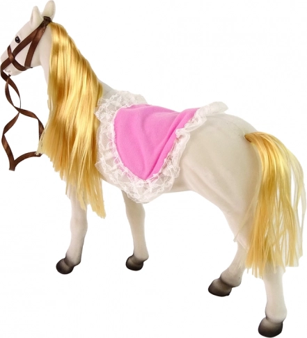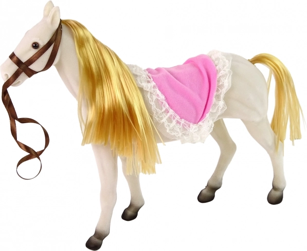 A készlet tartalmazza a hajlítható végtagokkal rendelkező hercegnőt és egy fehér lovat, amely kellemes anyagból készült a valóságos megjelenés érdekében.