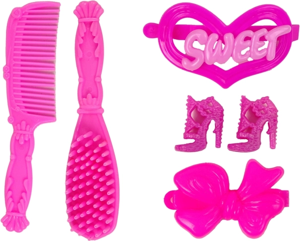 A készlet tartalmaz rózsaszín fésűt, kefét és egyéb styling kiegészítőket, amelyek támogatják a gondozást és a kreativitást játék közben.