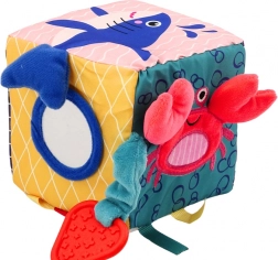 A kocka susogó elemeket is tartalmaz, amelyek érintésre finom hangot adnak ki, stimulálják a hallást és ösztönzik a játékot.