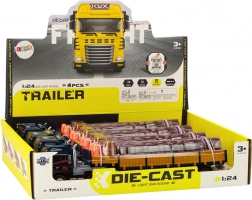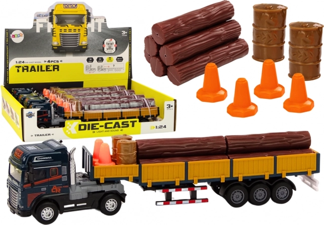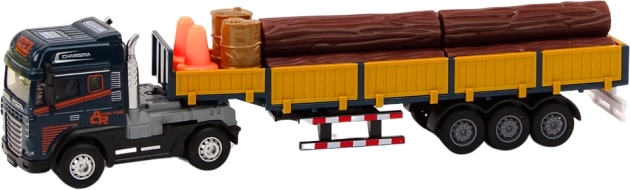 A 1:24 méretarányú, valósághű teherautó-modell kék fülkével, lecsatolható félpótkocsival levehető oldalfalakkal és fa rönk rakománnyal érkezik. A még szórakoztatóbb játékért fény- és hangeffektek (motorindítás, tolatás) és felhúzható/szabadonfutó előremenet áll rendelkezésre. A készlethez forgalmi bóják és két hordó is tartozik a rakodási és „építési terület” szcenáriókhoz. CE tanúsítvány, EN71 megfelelőség, 3 éves kortól ajánlott.