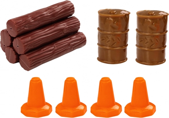 A félpótkocsi könnyen lecsatolható, így a gyerekek külön is játszhatnak a vontatóval és a pótkocsival. A szett tartalma 4 forgalmi bója, 2 hordó és fa rönk rakomány, amelyek bővítik a játéklehetőségeket, és fejlesztik a képzelőerőt és a finommotorikát.