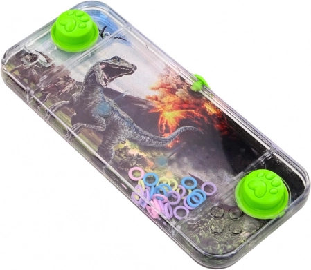 A Carnotaurus dinoszaurusz motívummal ellátott zsebes vizes játék egyszerű, mégis rendkívül szórakoztató. Az átlátszó víztartályban színes karikák lebegnek, a feladatod pedig, hogy a két zöld gomb segítségével pontosan adagolt nyomással a karikákat a belső két tüskére illeszd.