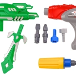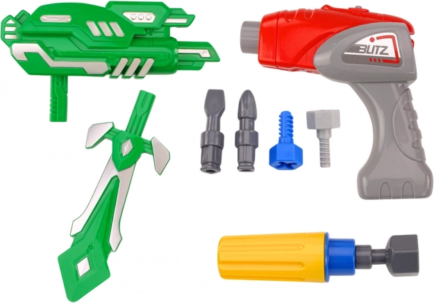 - Játékfúró cserélhető fejekkel, csavarhúzó, kard és fegyver