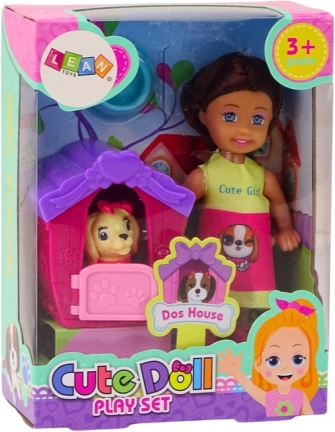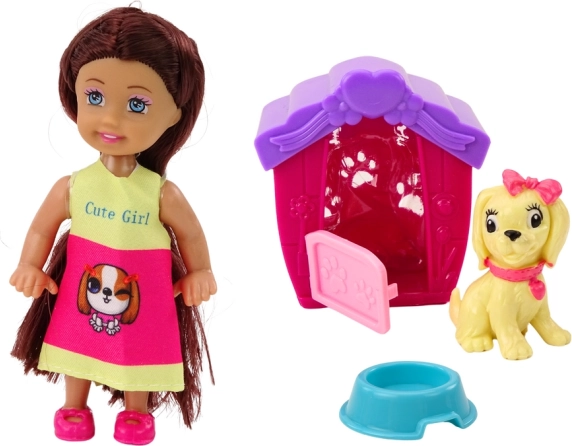 Mini baba hosszú hajjal és színes szoknyával kutyával és kutyaházzal