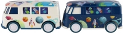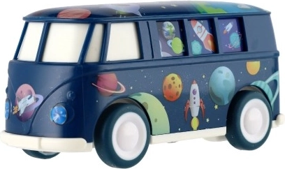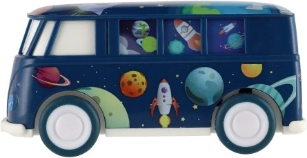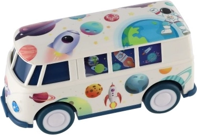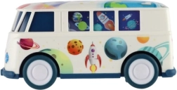 A buszt élénk színekkel és űrmotívumokkal tervezték, amelyek bármelyik gyerek figyelmét felkeltik.