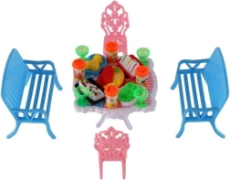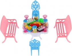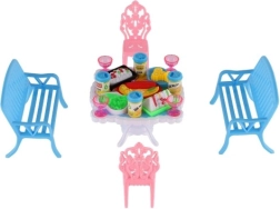 A készlet 2 padot, 2 széket és egy asztalt tartalmaz, továbbá 13 darab kiegészítőt – poharakat, dobozos italokat, tányérokat és egy tálcát. Minden, ami egy babalakomához kell.