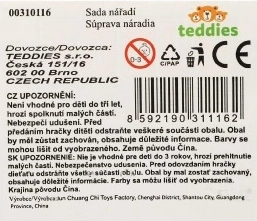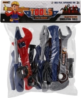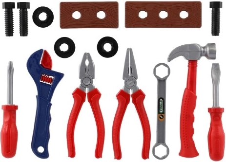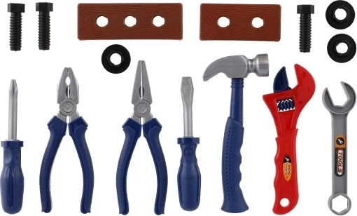 A készlet részei a tipikus eszközök, mint a kalapács, csavarhúzó, fogó és kulcs, valamint anyák és csavarok a csavarozás gyakorlásához. A praktikus tasaknak köszönhetően a tárolás és a szállítás gyerekjáték – ajándéknak is remek.