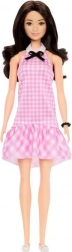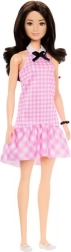 A Barbie Fashionistas baba a Quick Curl 1973-as megjelenése által ihletett retró stílus modern értelmezését hozza el. Az elegáns, rózsaszín gingham minta ruha fekete nyakmasnival, fehér lábbelivel és fekete karkötővel teljes, sikkes szettet alkot a mindennapi és ünnepi játékhoz egyaránt.