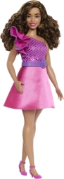 A Barbie Fashionistas baba tiszteleg a legendás stílus előtt, és végtelen történetmesélési lehetőségeket kínál gyerekeknek és gyűjtőknek egyaránt. Az elegáns, egyvállas rózsaszín ruha látványos fodorral egyszerre trendi és időtálló, míg a csillogó felsőrész csillagfényes hatást ad az öltözéknek.
