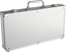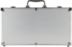 Elegáns alumínium kofferben lévő pókerkészlet ideális szórakoztató és stratégiai estékre. 300 zsetont tartalmaz öt különböző értékben, két pakli játékkártyát és öt dobókockát a felejthetetlen játékélményért.