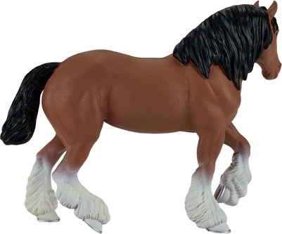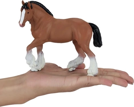 A Clydesdale ló masszív testfelépítésének hű ábrázolása: finom szőrtextúra, hangsúlyos izmok, sörény és bokaszőr. Vitrinbe és gyerekjátékhoz egyaránt látványos.