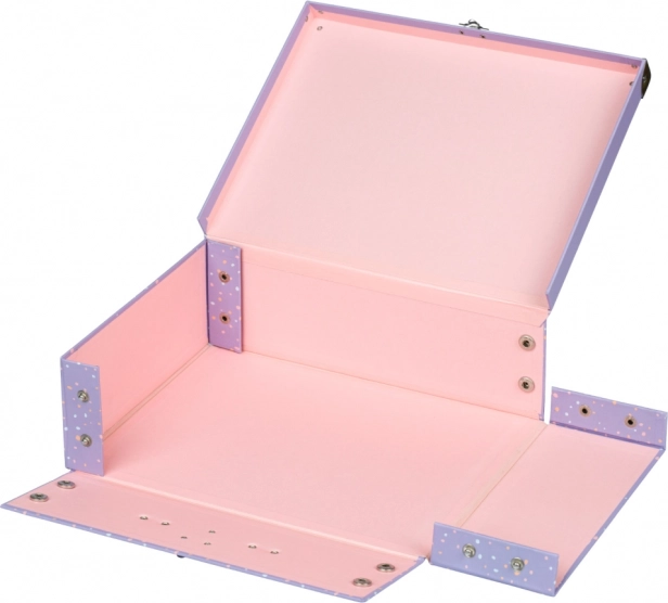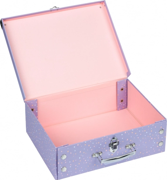 A bőrönd játékos dizájnt kombinál praktikus felhasználással. A fém fogantyú és a szegecselt sarkok biztosítják a tartósságot és szilárdságot.