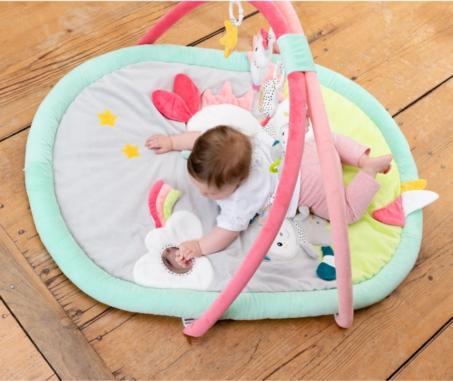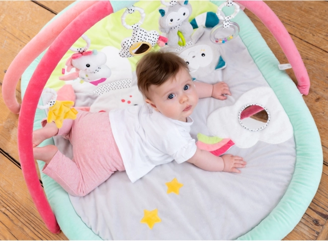 Puha steppelt takaró Aiko & Yuki néven, amely érintésre, ölelgetésre és játékra hív a fekvőfelületen, változatos anyagú struktúrákkal és felületekkel. A játékívre akasztott háromdimenziós figurák segítik a célzott megfogást és a kéz-szem koordinációt. A babát leköti a sípoló egyszarvú benne rejtett hörcsöggel, a csörgő macska, a csiripelő felhő és a susogó csillag. A vidám állatkák támogatják a szórakozást játék közben, növelik a figyelmet, és fejlesztik az érzékeket és a motorikát.