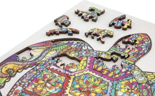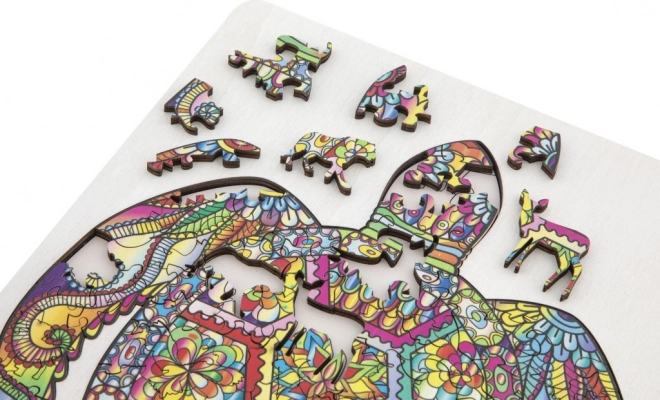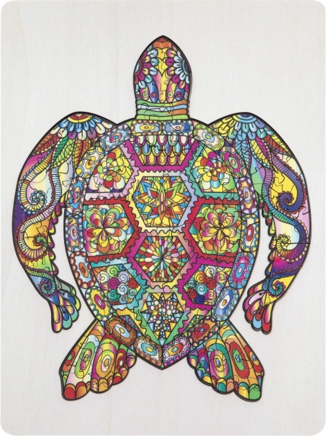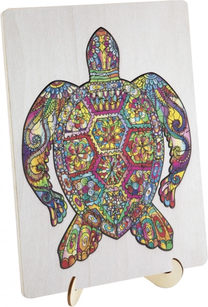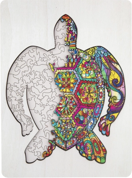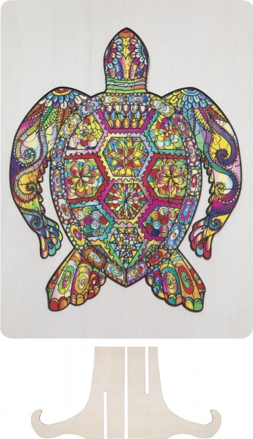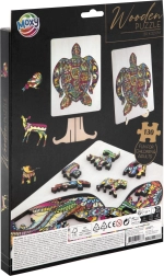 Fa kontúros puzzle teknős alakban, különböző formájú darabokkal ideális gyerekeknek és felnőtteknek egyaránt. Állatokat és tárgyakat formáló darabokat tartalmaz, ami növeli a vonzerőt és szórakozást.