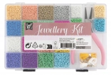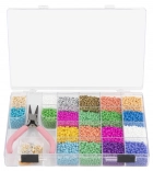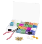 A nagy gyöngyszett ékszerkészítéshez tartalmaz – 20 színű gyöngyöt, kis fogót, arany- és ezüstszínű kapcsokat és összekötőket + arany- és ezüstszínű fűződrótot a felfűzéshez.