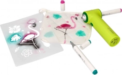 Ez az AirBrush kreatív készlet tökéletes eszköz mindenkinek, aki szeretné fejleszteni kreativitását és egyedi mintákat létrehozni textíliákon. A készlet mindent tartalmaz, amire szüksége van az induláshoz – permetező eszközt, sablonokat és színes filceket.