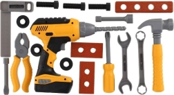 Tartalmaz fúrót, kalapácsot, csavarhúzót, fogót, kulcsot és csavarokat. Ideális a motorikus készségek és a kreatív gondolkodás fejlesztésére.