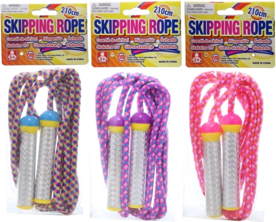 Vidám színes ugrókötél gyerekeknek. Ideális szórakozáshoz és motoros készségek fejlesztéséhez. Könnyű műanyag fogantyúk biztosítják a könnyű megfogást a legkisebbek számára is.