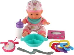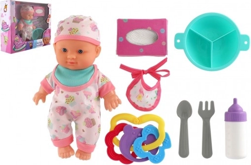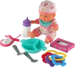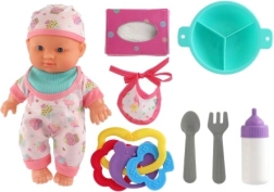 A csomag része egy cumisüveg, egy csörgő, nedves törlőkendők és egy baba étkészlet, amelyek támogatják a valósághű játékot, valamint fejlesztik a motoros készségeket és a szerepjátékot.