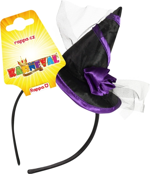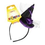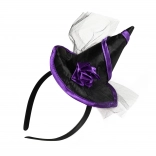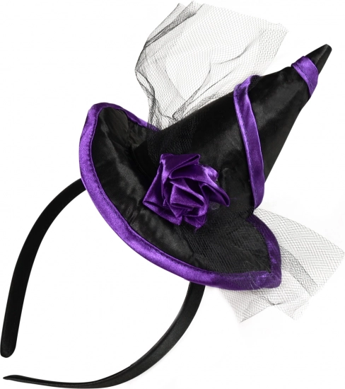 Stílusos boszorkány fejpánt, tökéletes kiegészítő bulira, farsangra és Halloweenre. Ötvözi a fekete–lila színvilágot, a szatén mini kalapot és a tüll virágdíszt a feltűnő, fotogén megjelenésért.