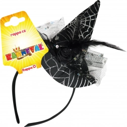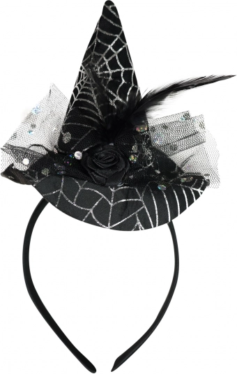 **Jellemzők:** - Fekete szín - Mini kalap pókhálós díszítéssel - Tüll és tollas dekoráció - Ideális Halloween vagy más témás partikra