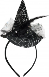 Ez a stílusos boszorkány fejpánt tökéletes kiegészítő egy partyra vagy Halloween bulira! A fekete fejpánt kiegészül egy mini kalappal, amelyet pókhálós díszítés és tüll dekoráció tölt ki tollas részletekkel.